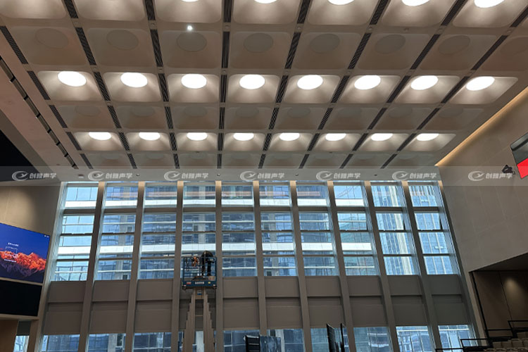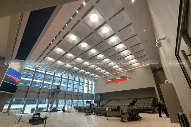此為深圳中海某多功能會議廳項目,該項目創新性的用砂巖吸聲材料(微粒吸聲板)為原料,通過3D開模固化的吸聲燈罩,單個燈罩達1.5米寬,現場共定制安裝多達70余個,項目特點:現場天花高達十多米,單個燈罩非常重,給安裝帶來不少難度,其燈罩造型復雜非常考驗刮搪師傅手藝。盡管難度不小,我司仍然在一個月內完成施工任務,為項目進度節省充裕工期。