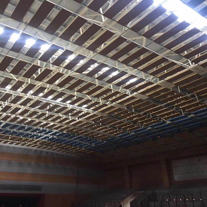 對于采用頂部網架或者桁加暴露形式的比賽大廳,可以將屋面下皮設計成強吸聲構造,如果還不能滿足控制混響時間的要求,可以在網架或桁架內設置空間吸聲體。亦可做垂掛的玻纖天花吸音板。