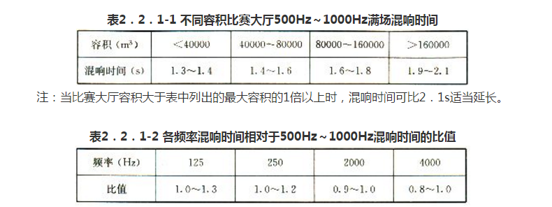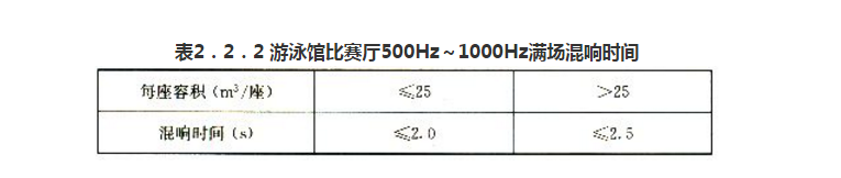 游泳館比賽廳500Hz~1000Hz滿場(chǎng)混響時(shí)間宜滿足表2.2.2的要求;各頻率混響時(shí)間相對(duì)于500Hz~1000Hz混響時(shí)間的比值宜符合本規(guī)程表2.2.1-2的規(guī)定。