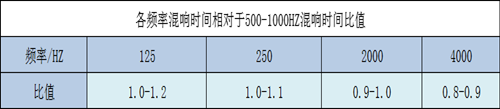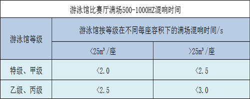游泳館比賽廳按等級和每座容積規定的滿場500-1000HZ混響時間及各頻率混響時間相對于500-1000HZ混響時間比值。宜符合下表規定: