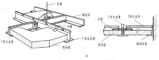 (3)暗龍骨安裝構(gòu)造。將帶企口邊的方形或矩形礦棉吸聲板與倒T形次龍骨翼緣嵌裝,使懸吊式頂棚面層不露龍骨,如下圖 c)所示。