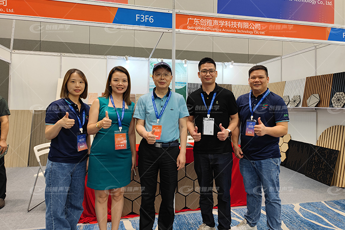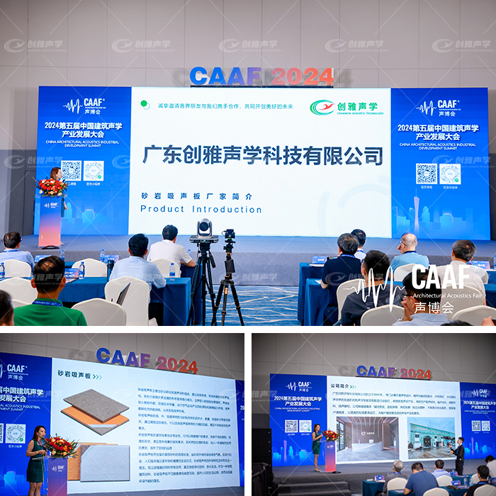廣東創(chuàng)雅聲學科技有限公司作為聲學解決方案提供商,成功參加了這次大會,并作為特邀嘉賓分享講話,主題為“砂巖吸聲板的應用”。我們以卓越的技術實力和創(chuàng)新產品吸引了大量觀眾的關注。