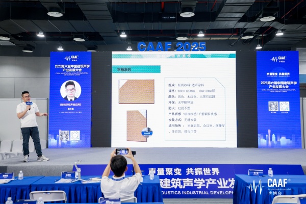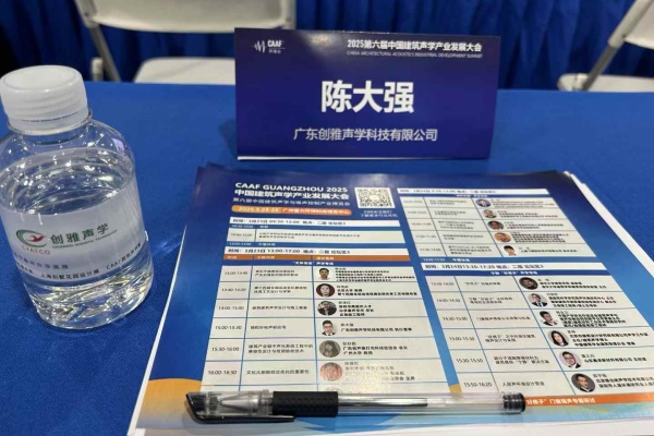 在同期舉行的產業大會上,廣東創雅聲學科技有限公司執行董事陳大強董事長發表了題為《微粒砂吸聲板應用》的主旨演講,首次系統性揭秘這款劃時代聲學產品的技術內核。