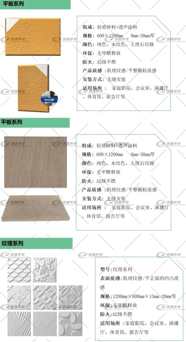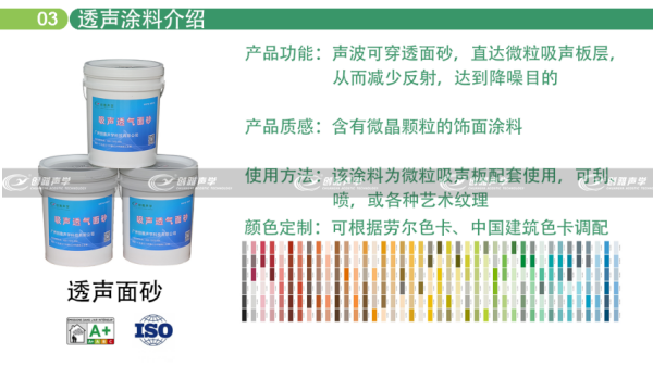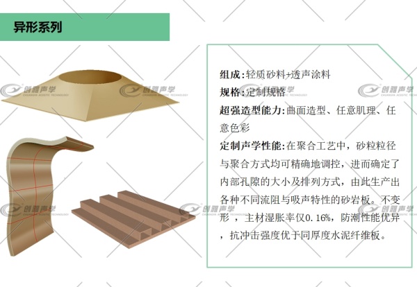 及強度,進而控制內部孔隙的大小及排布方式,形成不同聲學及裝飾效果的飾面,同時每個顆粒表面均覆蓋有專用養護劑,形成特殊的荷葉效應,使得水分子無法進入材料內部。該工藝生產的產品強度高、防火性能極佳、防水防潮、耐候性極佳。實驗數據顯示,其降噪系數(NRC)可高達0.95,覆蓋全頻段吸音需求。