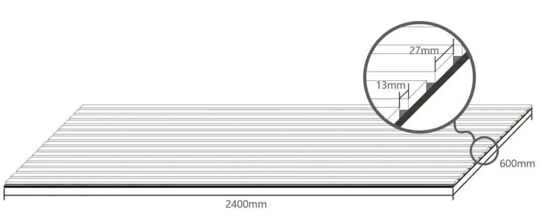 尺寸: 2400mm(長) 600mm(寬) 21mm(厚),單片面積1.44㎡