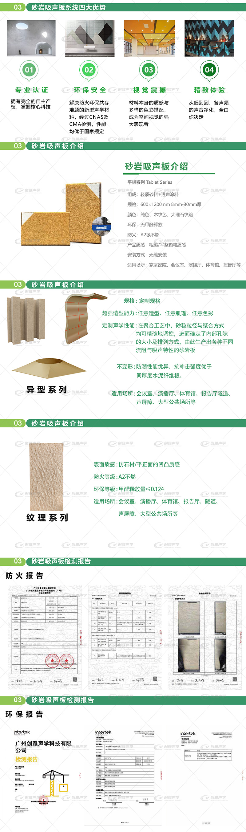 產品介紹:聚砂吸聲板又名砂巖吸音板、陶晶吸聲板等,其主要成分是輕質陶粒,具有A級防火,又環保,又防潮的特點,非常適合用在消防要求高,又需要吸聲的場所,比如藝術館,教室,會議室等,材質輕盈,特別適合用于天花板。