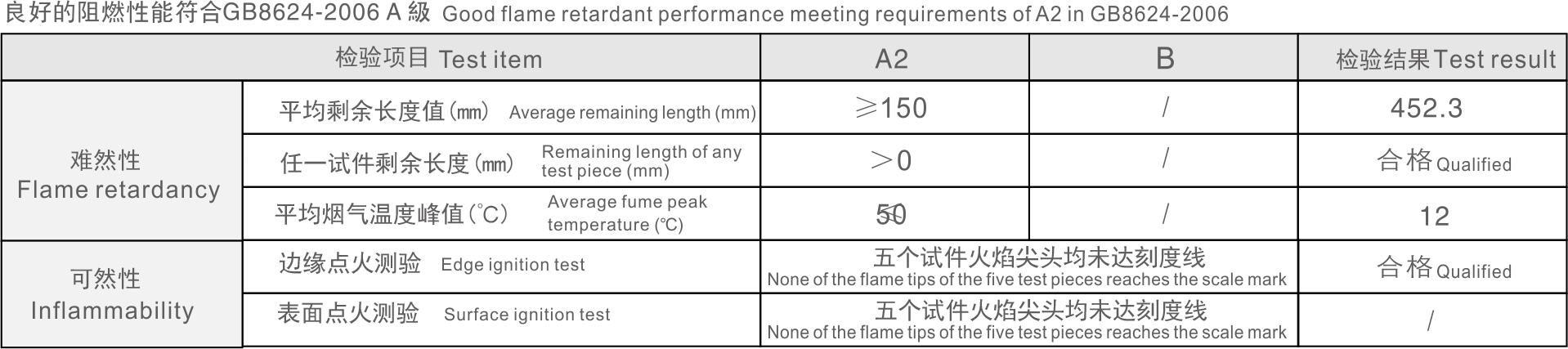 防火性能:防火檢測結果符合GB8624-2006 A級要求